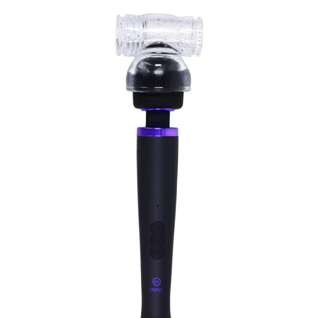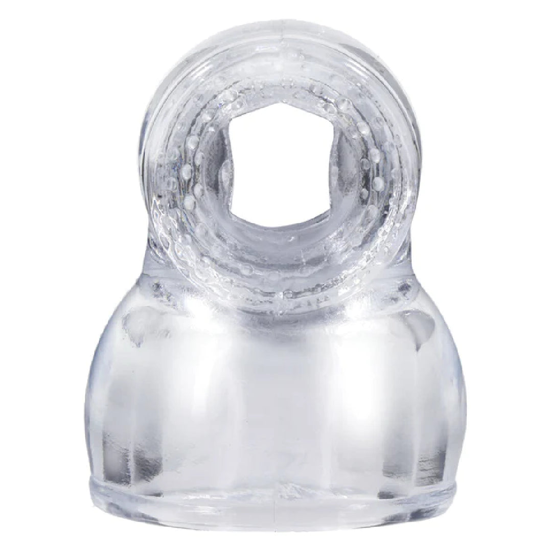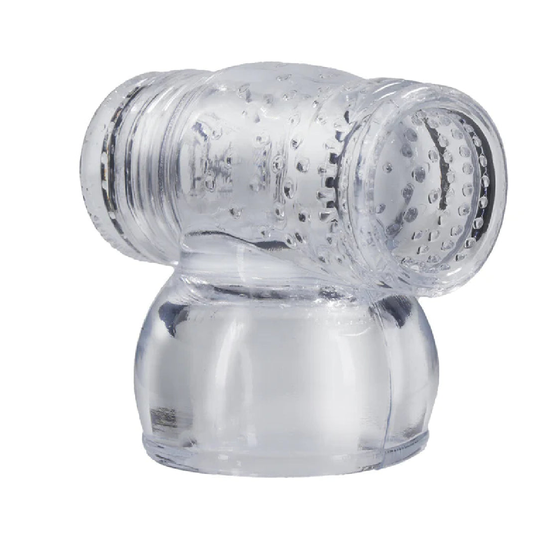 This tight, textured fuck tunnel stretches to form a snug fit in clear material that leaves nothing to the imagination, and is designed to perfectly fit most standard sized wands' vibrating head. Each end features its own unique fit and texture for a varied experience—tease the head by alternating between ends, or penetrate it all the way through the other side.