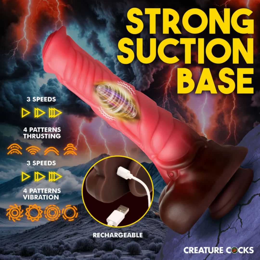 Live out your fantasies and explore kinky centaur, horse cosplay. The veiny red shaft is long with ridges and grooves that look like armor and will rub you in all the best ways. It is firm yet flexible and can squish to fit in even the tightest spaces. This centaur packs powerful magic with 3 speeds and 4 patterns of thrusting and vibration that make this a wild ride indeed!