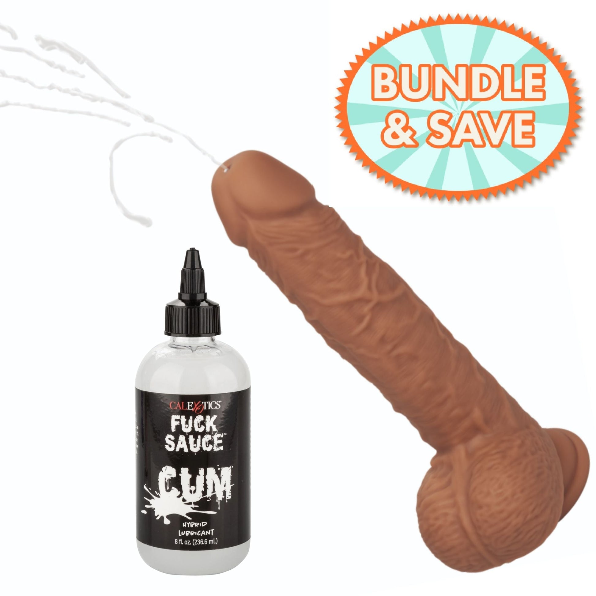 Shoot your load again and again with the Fuck Stick Squirting Vibrating Dildo (chocolate) and Half Price Fuck Sauce Cum Lube bundle. Everything you need for a wet and wild time!