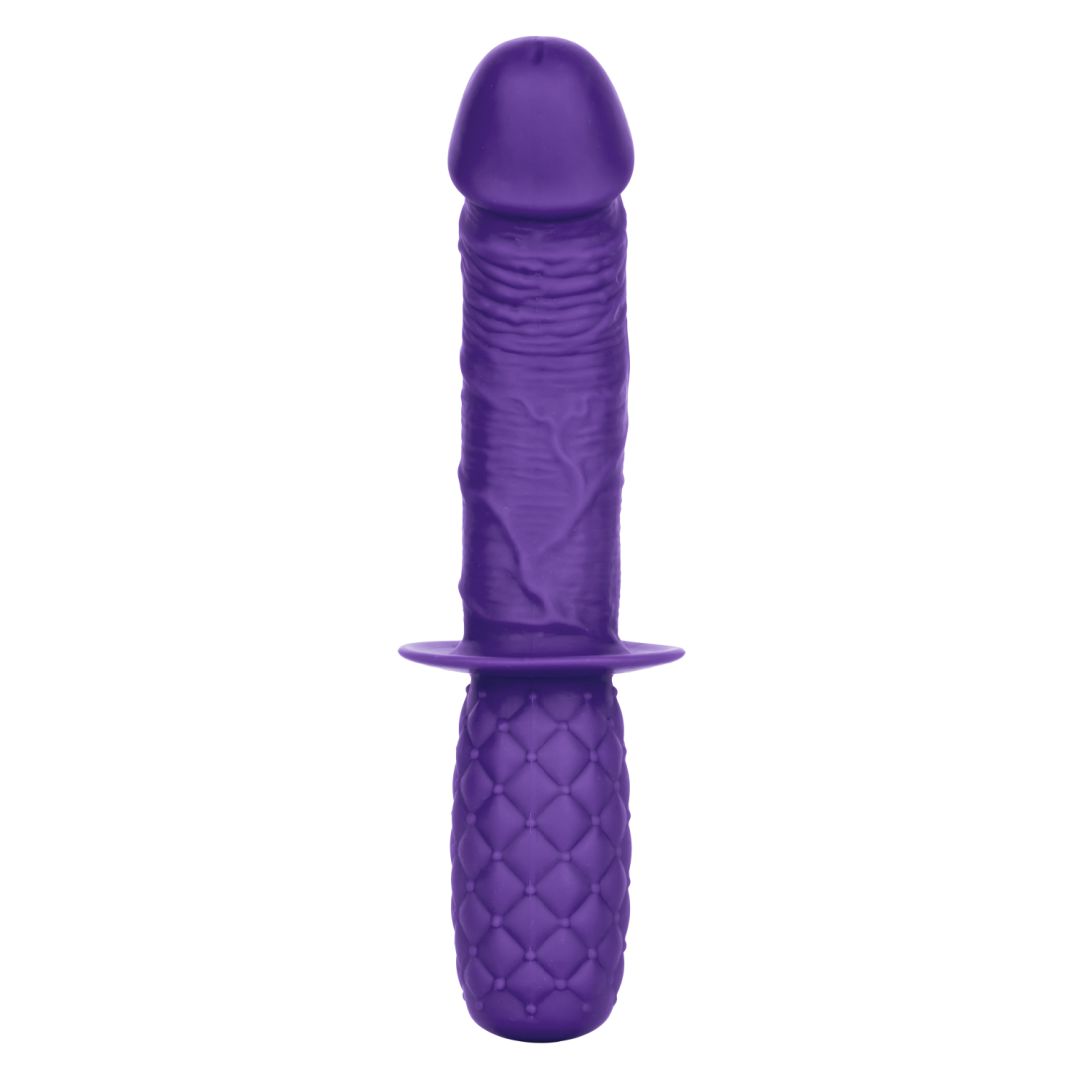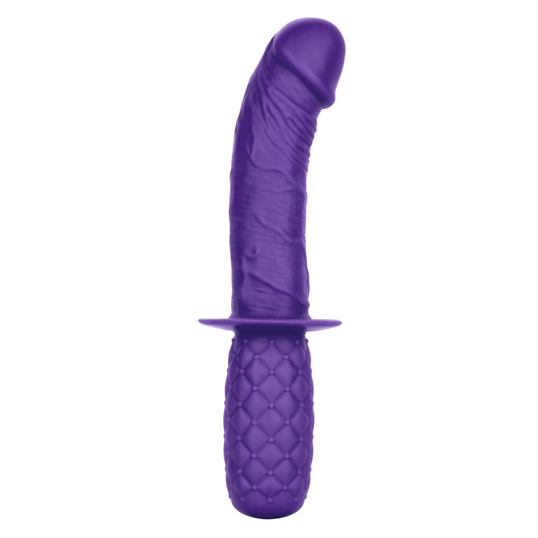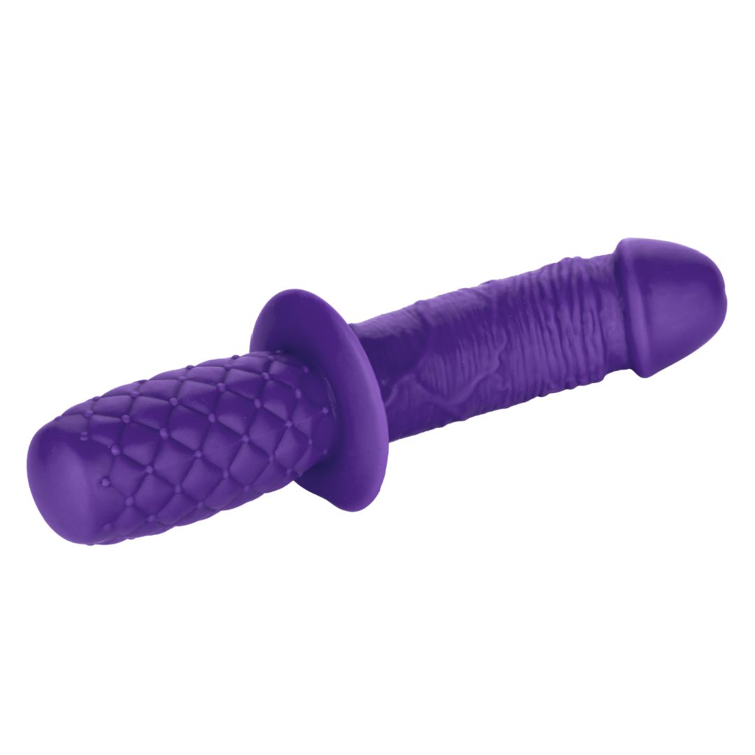 This is a dildo made for thrusting and your g-spot or prostate will thank you! With a textured grip handle, curved shaft, and average size, this is a fantastic dildo for beginners, anybody who has reach issues, or those who want a tighter grip for intense thrusting action that isnt' too deep.