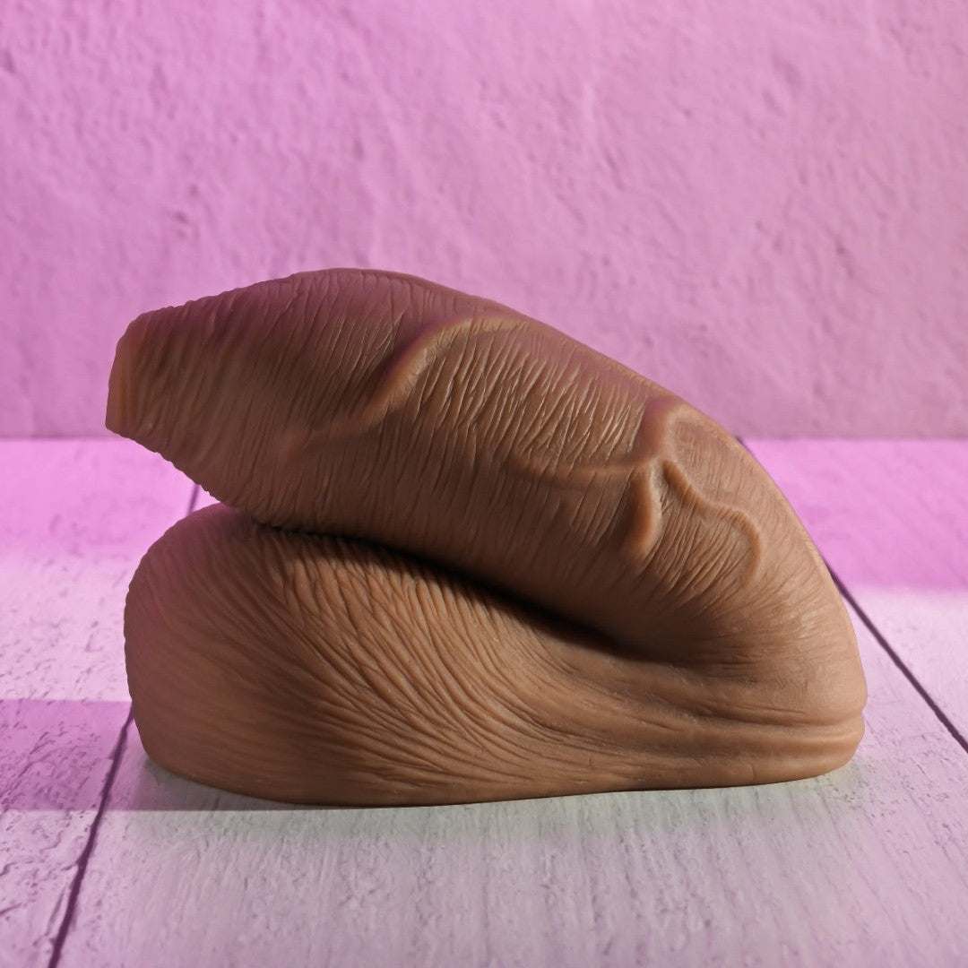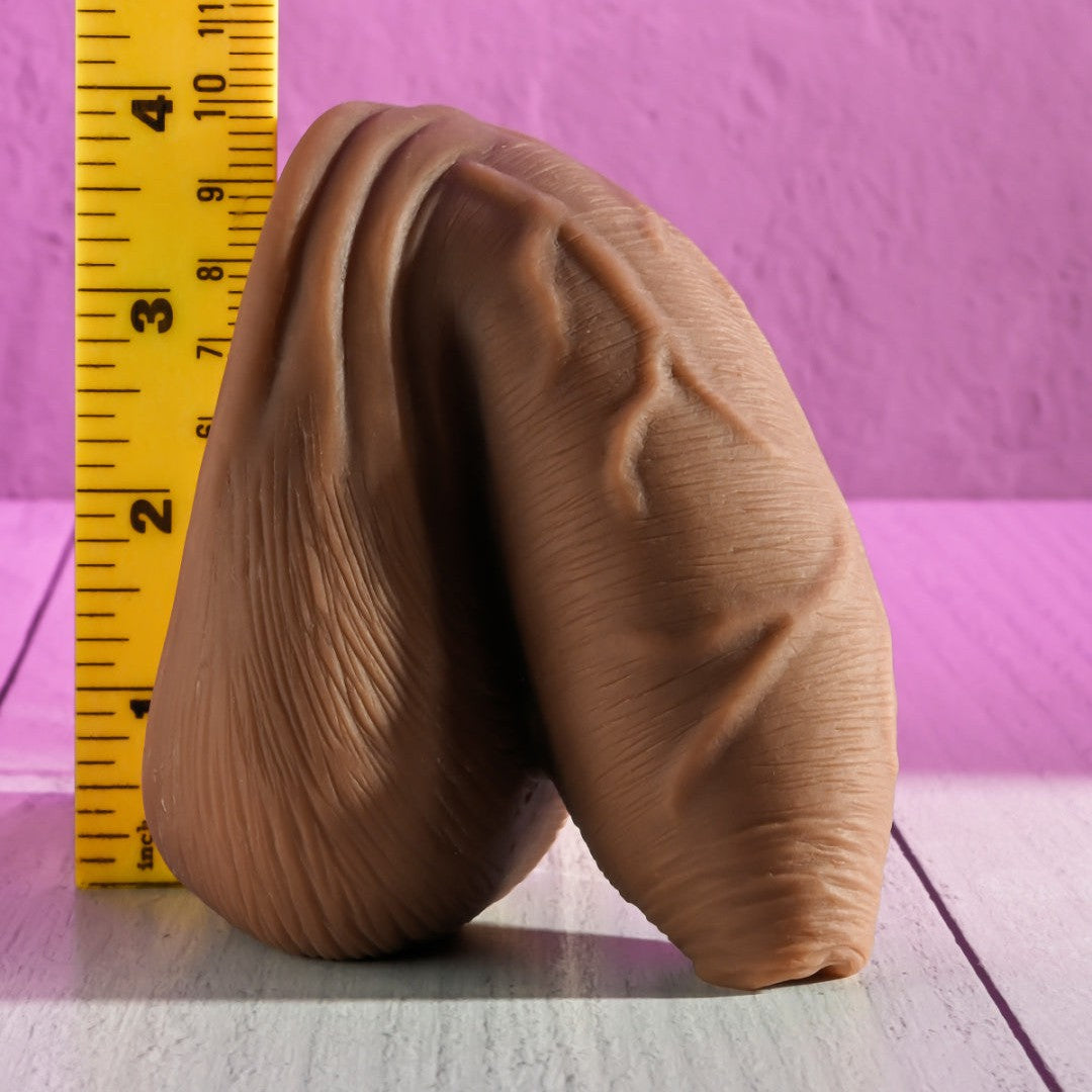This true to feel packer features a realistic uncircumcised penis and balls with life-like veins and wrinkles, designed as a satisfying weight to tuck securely into close fitting garments.