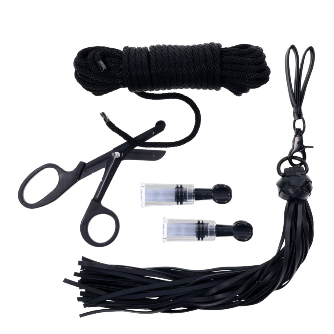 Contains: 30ft. black silky rope, 13in. faux leather finger flogger, Dual nipple suckers with twist suction and rubber air seal, Safety sheers included