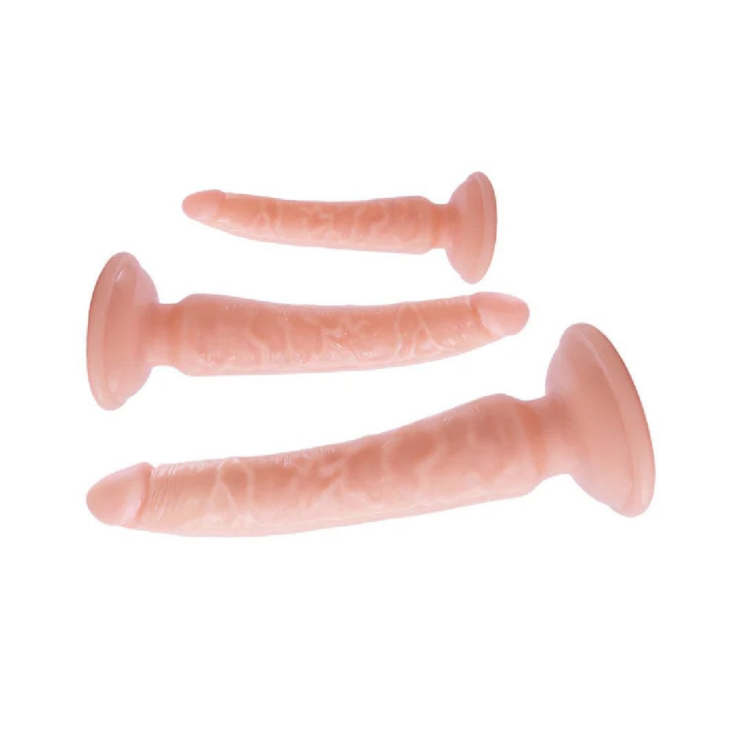 This Trio brings a sexy realistic look to a more advanced anal trainer set. Perfect for anybody who loves anal and wants to stretch their boundaries, these phallic dildos are veiny and tapered at the tip for easy entry. The suction cup bases let you explore hands-free or strap them on for a thrilling pegging experience.